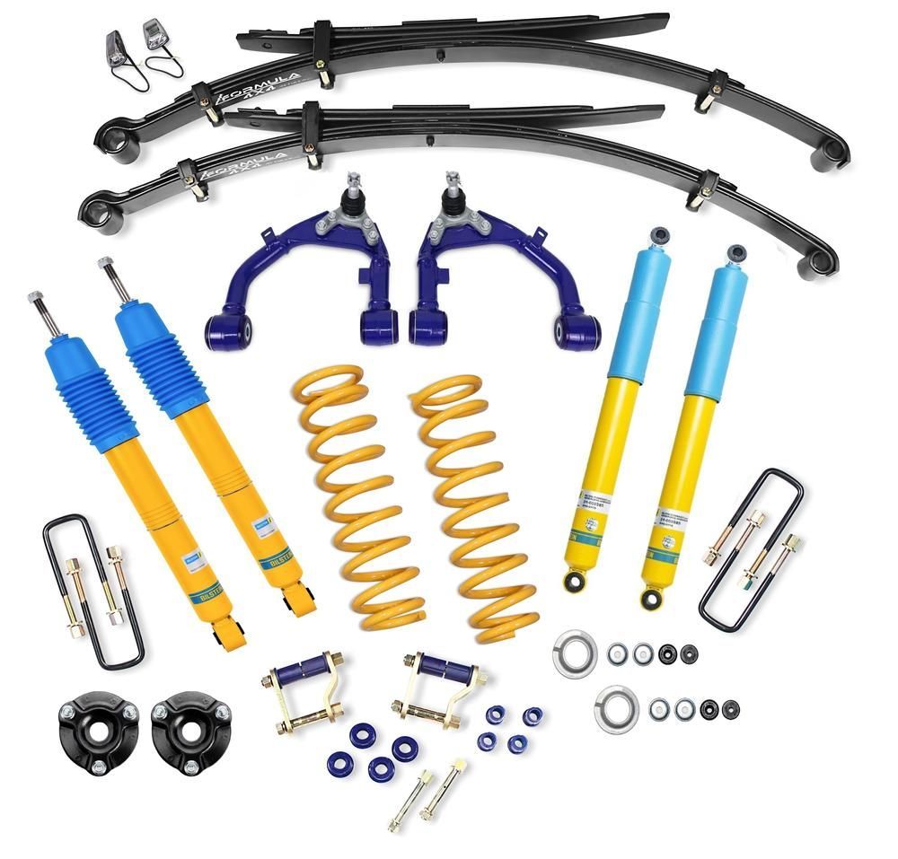 Bilstein Shock Absorbers 24-359238 x 2 & 24-322577 x 2, SuperPro Fixed Offset Upper Control Arm Kit TRC6590 x 1, Strut Mounts RS005 x 2, King Springs KTFR-101HT x 1, Formula 4x4 Leaf Springs FLS-150 x 2, Formula 4x4 U-Bolts FUB-006 x 4